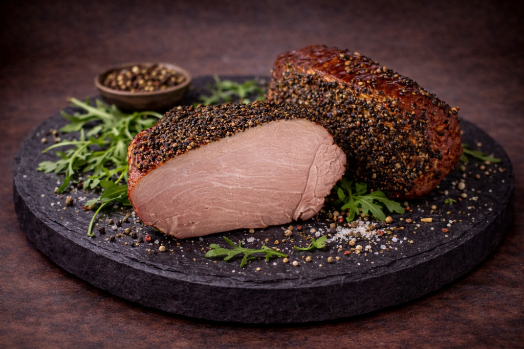 Wędzony boczek premium, przygotowany z najwyższej jakości wieprzowiny, powoli wędzony na drewnie bukowym